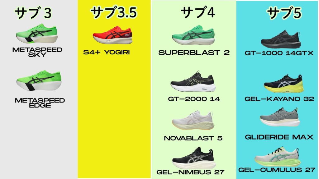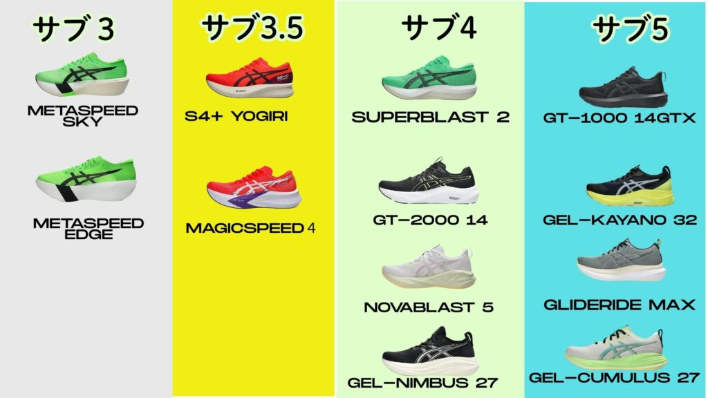 【図解でわかるタイム別】ASICSランニングシューズチャート