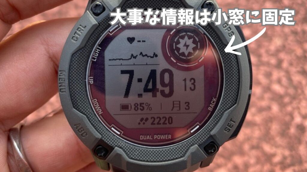 小窓は自由にカスタマイズできるので、心拍だけでなくバッテリー残量なども表示できます。