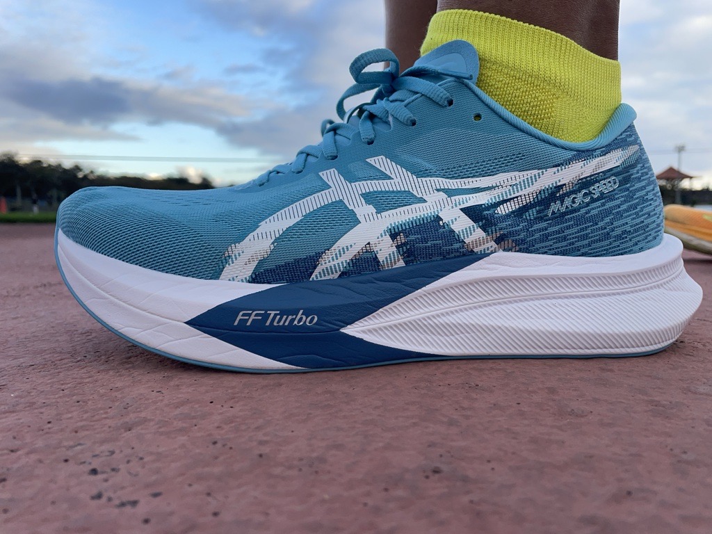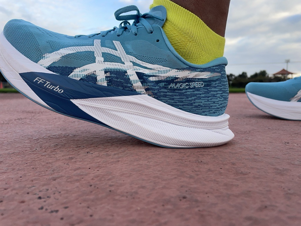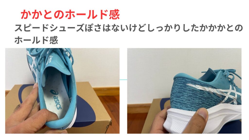 多くのスピードシューズは、かかとが浅い作りで抜け感が気になります。ですが、マジックスピード4のかかと周りはしっかりホールドしてくれる作りになっているので、フィット感をさらに感じて安心して走ることができます。