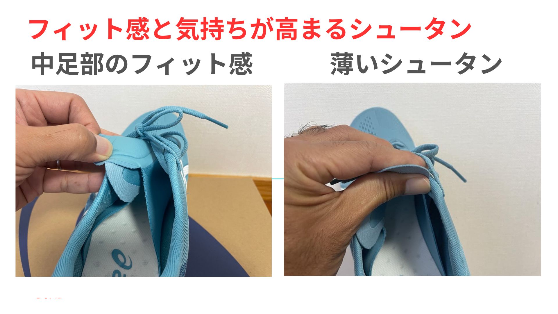 アッパー全体は足を包み込むようなフィット感がある一方で、シュータンはあえて薄く仕上げられており、スピードシューズモデルらしい高揚感を高めてくれます。