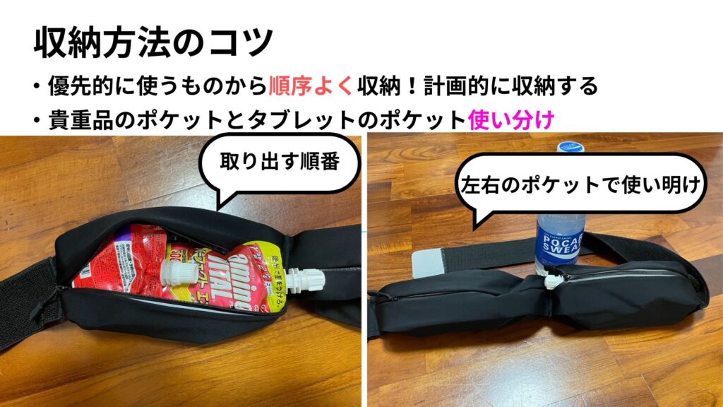 必須のアイテムを効率よく持ち運ぶのにポーチが揺れてランニングに集中できない。